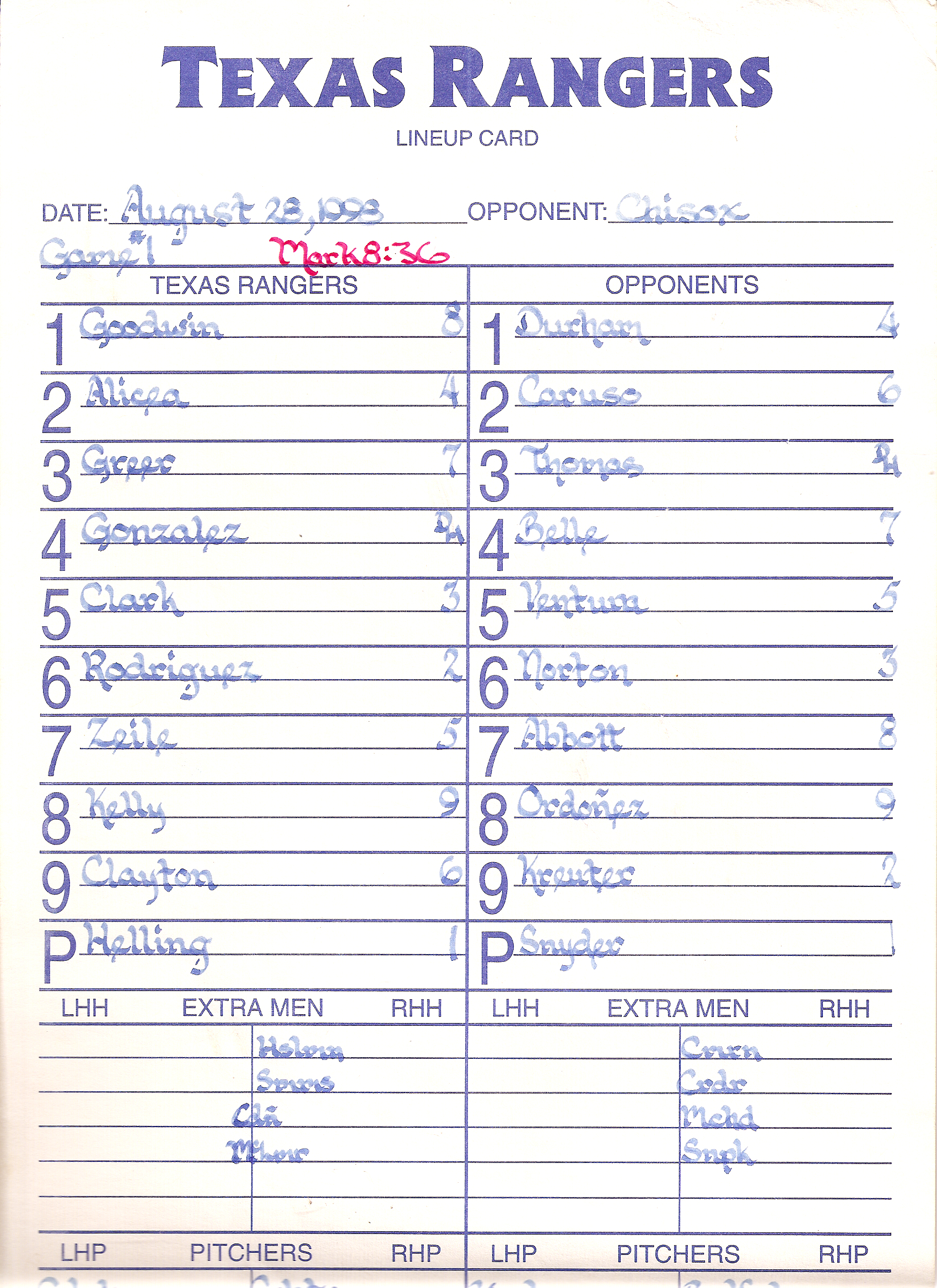 This was one of Narron’s line-up cards while serving as a coach in Texas – a 1998 piece. His work during his one year for Tito Francona in Boston is still treated with hushed reverence by the Sox skipper, who says he has kept some of Narron’s line-up cards. One will notice that besides the calligraphy, there is a boxscore quality to the reserves. The White Sox “extra men” include “Cmrn” and “Snpk” – Mike Cameron and Chris Snopek.