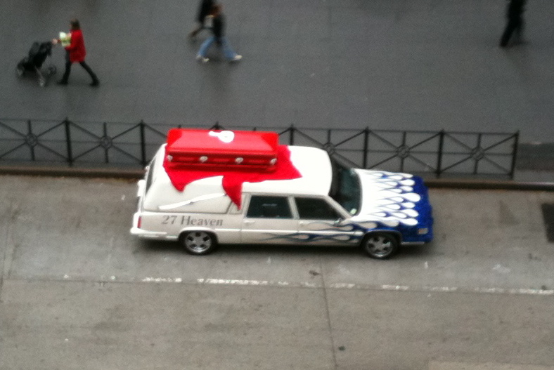 Sure looks like a Phillies “P” on the casket and wasn’t this the Yanks’ 27th WS win?