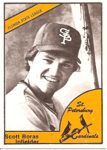 The next thing to fall out of the fast pile of stuff that is “the collection” is nothing less than a 1977 TCMA card of a career minor league infielder who would only play 88 games higher than A-ball, and then branch off into another field. Yes, that’s the same Scott Boras, agent to the stars and scourge of general managers and owners everywhere. Boras spent a little more than two seasons with the St. Petersburg Cardinals of the Florida State League, and would actually hit .346 in 22 games during the season in which the card was made before moving up to AA and then winding up in the Cubs’ system. His knees gave up on him, and he went to pursue an alternative career – as a pharmacist. He got that degree and then one in law, and then wound up representing his high school teammate, former big league infielder Mike Fischlin – and the rest was a history of gnashed teeth. Mostly a second baseman and third baseman, Boras actually has some good company in that ’77 set: later Cards’ second base hero Tommy Herr, current Pirates’ pitching coach Ray Searage, and other future major leaguers like Benny Joe Edelen, John Fulgham, John Littlefield, Danny O’Brien, Kelly Paris.