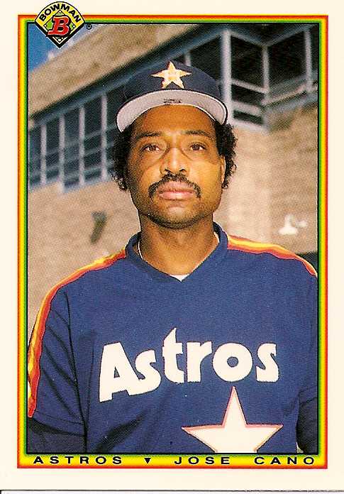 It never fails. Go looking for anything – from your comb to your Jamie Roseboro 1990 Bowman Glossy Baseball Card, and invariably you’ll stumble across something else. Which explains this card of Robinson Cano’s father, Jose. You may have seen him throwing (and rather successfully) to his son at the Home Run Hitting Contest before the All-Star Game. But the elder Cano actually became associated with the Yankees a quarter century before his son made the team. He signed with them as an 18-year old free agent out of the Dominican in 1980, but lasted just three games with their rookie league team before going home. Little Robby was born two years later, and then Dad returned to this country – and the minors – in ’83 in the Braves system, and made it to the majors in ’89 with the Astros. He pitched only six games, but started three of them, and actually pitched a pretty neat looking seven-hit complete game win over the Reds on the penultimate day of the 1989 season. That would be his last big league appearance, though he did get on two cards in ’90, and this is one of them.