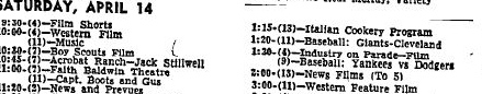 Sure enough, the impeccable Bill Francis of The Baseball Hall of Fame has dug up what I could not: Confirmation that the Dodgers-Yankees exhibition of April 14, 1951 – Mantle’s unofficial debut – was televised. Check out the entry for 1:30 PM on Channel 9, from The New York Times weekly tv listings, published on April 8, 1951: