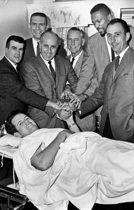 Just a quick trip back in time, to 1964, after the late Senator had broken his back in a plane crash, in route to accepting his nomination for his first full term. Two of these figures are instantly recognizable – the one at the far left has chops particularly relevant here… try to ID them all before reading the caption below.