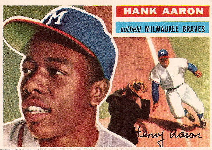 They did not discuss two of Aaron’s more interesting cards. Obviously the portrait on the 1956 card here is the young Henry. But who is that sliding into the plate, an “M” on his cap and nothing on his uniform?![]()