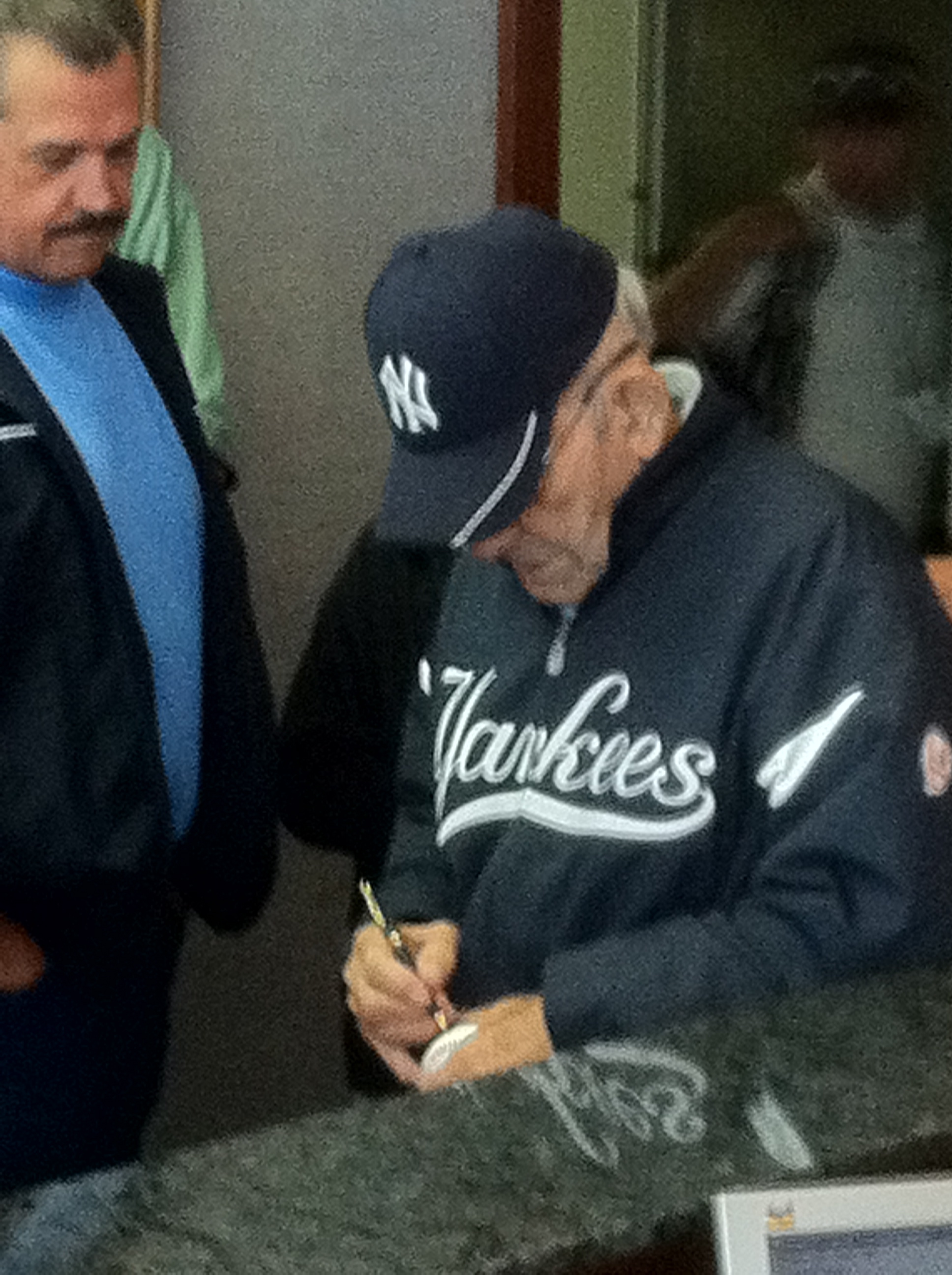 Yogi was well enough today to stay for the length of the Yankees’ game in Tampa against the Atlanta Braves. You see him here preparing to leave, with Ron Guidry at the left.![]()