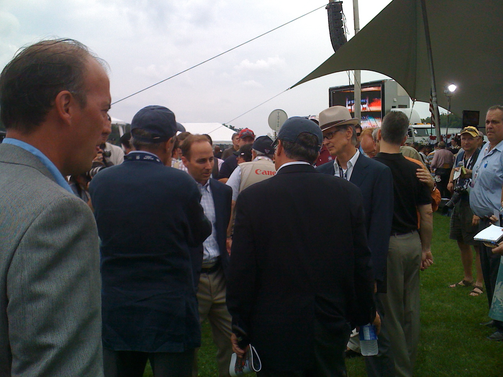 A little Yankee-Red Sox interplay. Brian Cashman at the left; Sox co-owner John Henry in the nifty hat, on the right:
