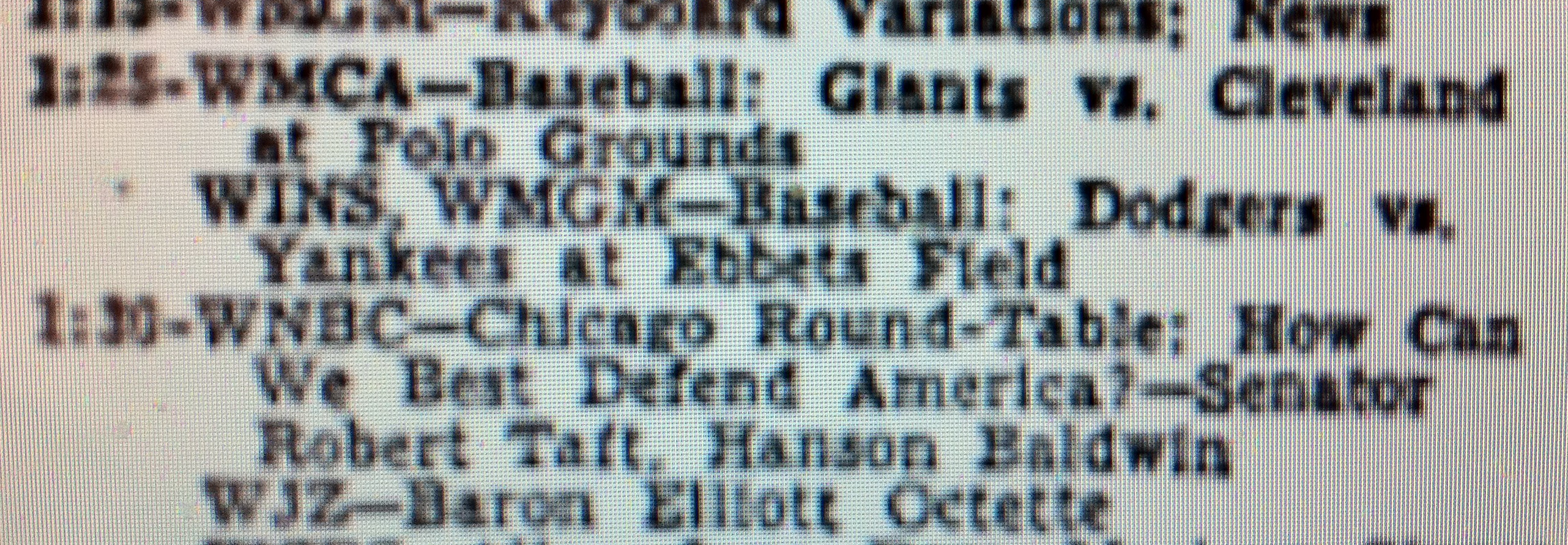 But there you have it: at minimum, Mantle’s first game ever in New York, on Saturday April 14, 1951, was broadcast by the Yankees’ station (WINS, with Mel Allen and two new colleagues who were replacing Curt Gowdy, named Bill Crowley and Art Gleeson), and was also carried by the Dodgers’ station, WMGM, with their announcers.