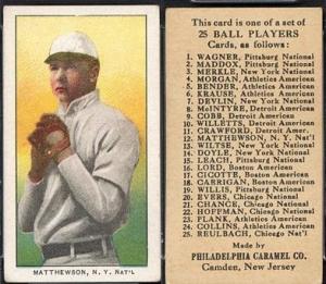 Here’s what I mean about relative attractiveness. The Mathewson and the Wagner below are from the E-95 set issued by Philadelphia Caramel in 1909. Find me 700 copies of them in superb condition and we’re talking.