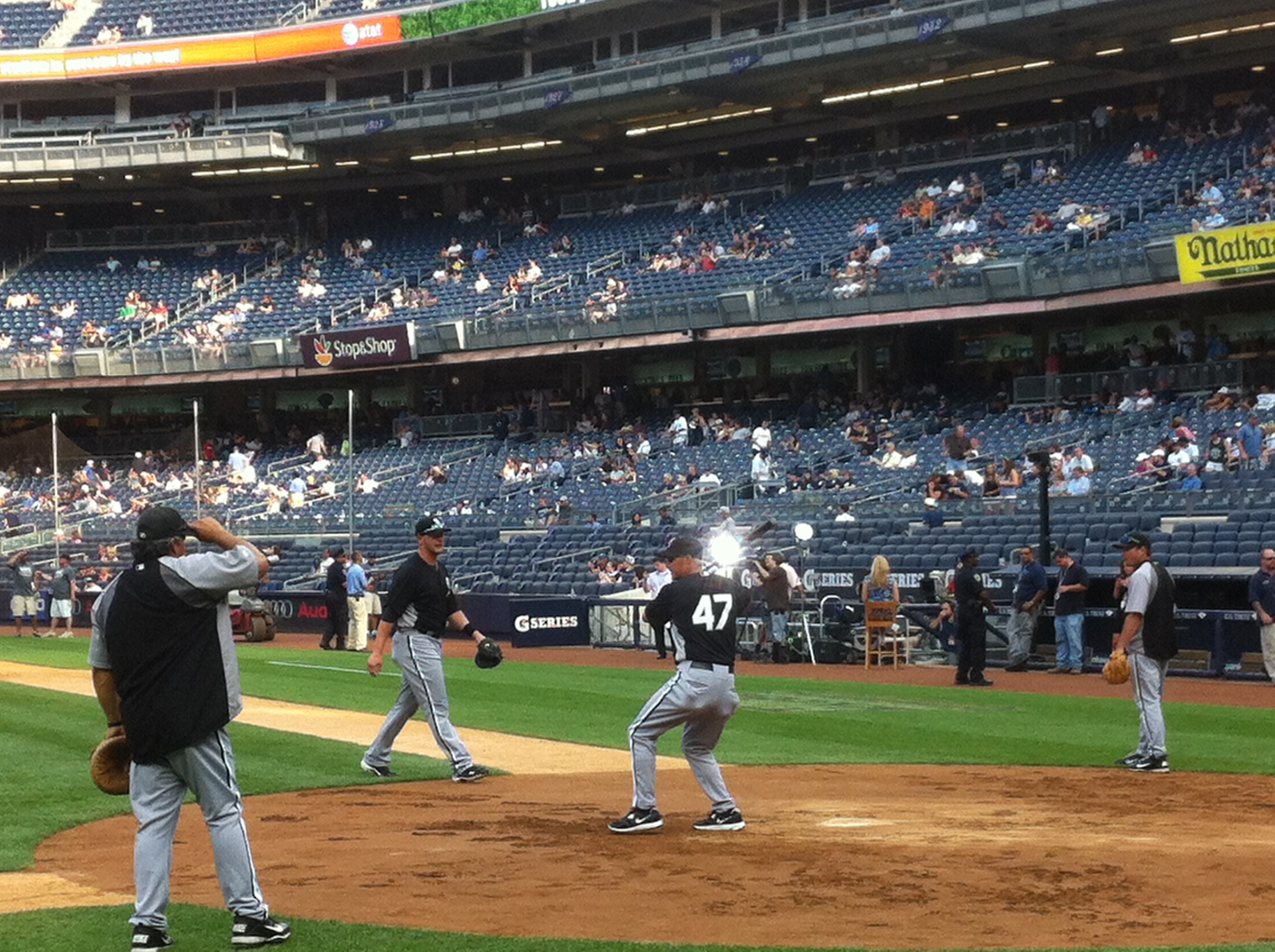 So imagine my joy when my old friend Robin Ventura came into Yankee Stadium for the first time as a manager last night, and at about 6:20 his Chicago White Sox were doing this under the guidance of another old friend, third base coach Joe McEwing (number 47), with back-up catcher Tyler Flowers to his left, and bullpen catcher Mark Salas.