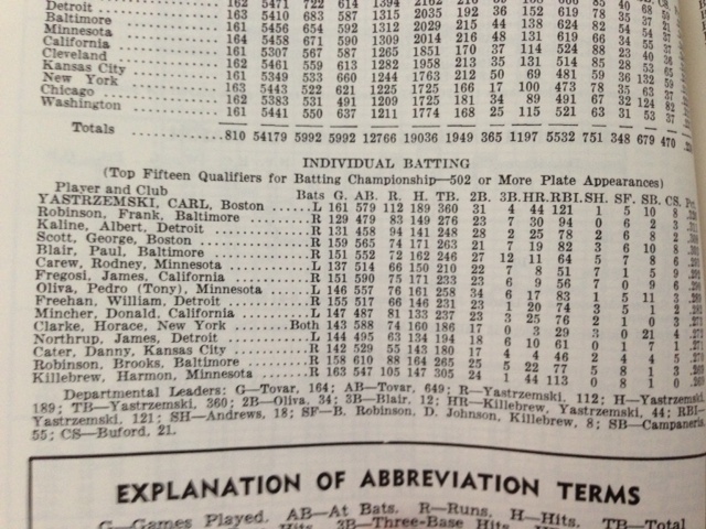The Triple Crown was The Triple Crown because it was the most sophisticated measurement of a batter’s total impact on the game. And in terms of historical placement, it was a gold mine. When Frank Robinson and Carl Yastrzemski won their Crowns we were still a couple of years away from The Baseball Encyclopedia. What those of us who did not have complete runs of The Sporting News Guide, The Reach Guide, The Spalding Guide, The Players’ League Guide, and Beadle’s Dime Base-Ball Player had, was The Official Encyclopedia Of Baseball.