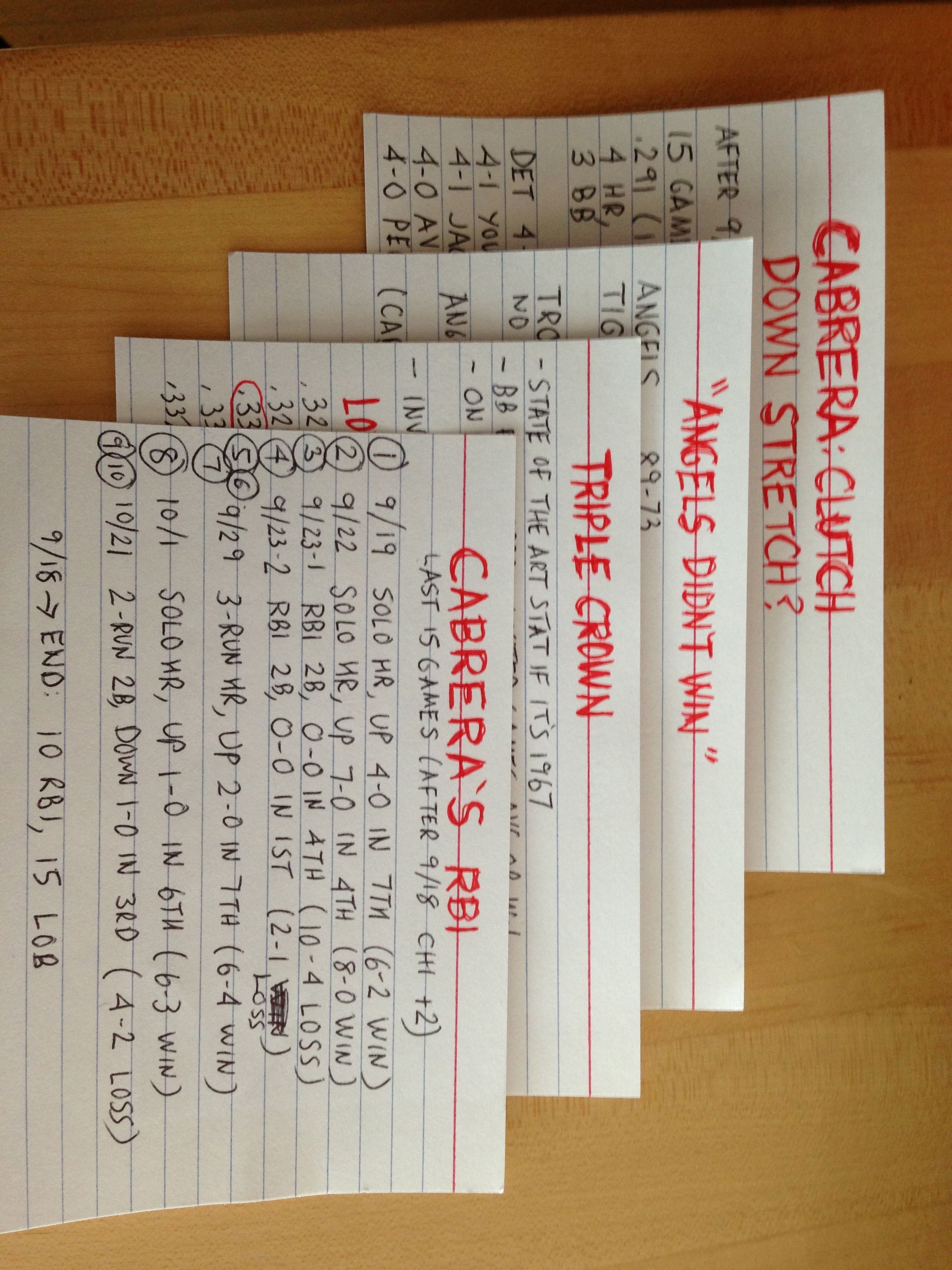 If you noticed the index cards in my hand, you’ll know that I offered a lot of data – not about VORP or WARP or BABIP or any of the new analytics – but essential hardcore boxscore stuff that undercuts the second biggest argument for Miguel Cabrera as American League MVP: That preference has to be given to the guy on the winning team, and that Cabrera ‘carried the Tigers on his back into the playoffs.