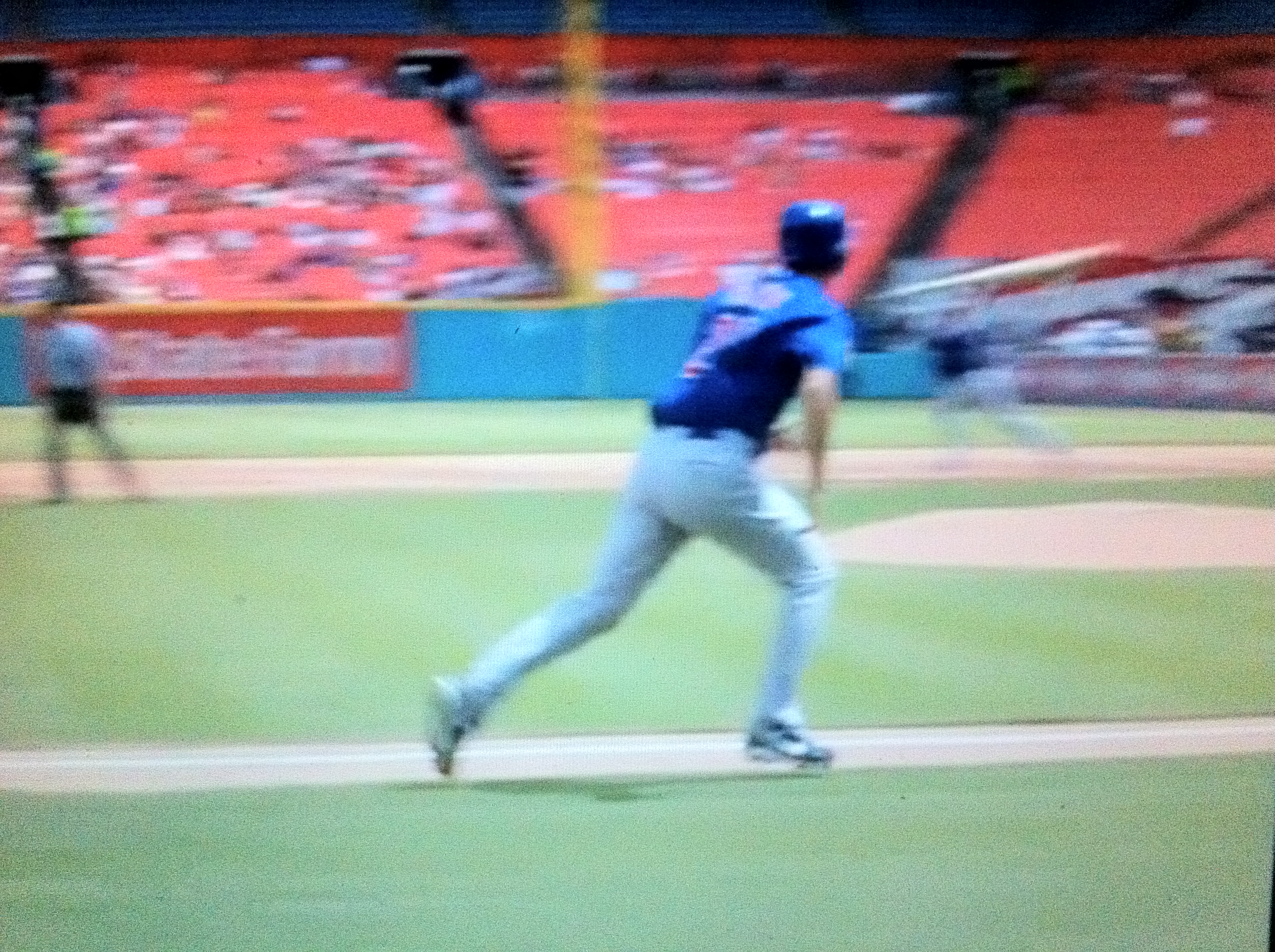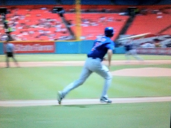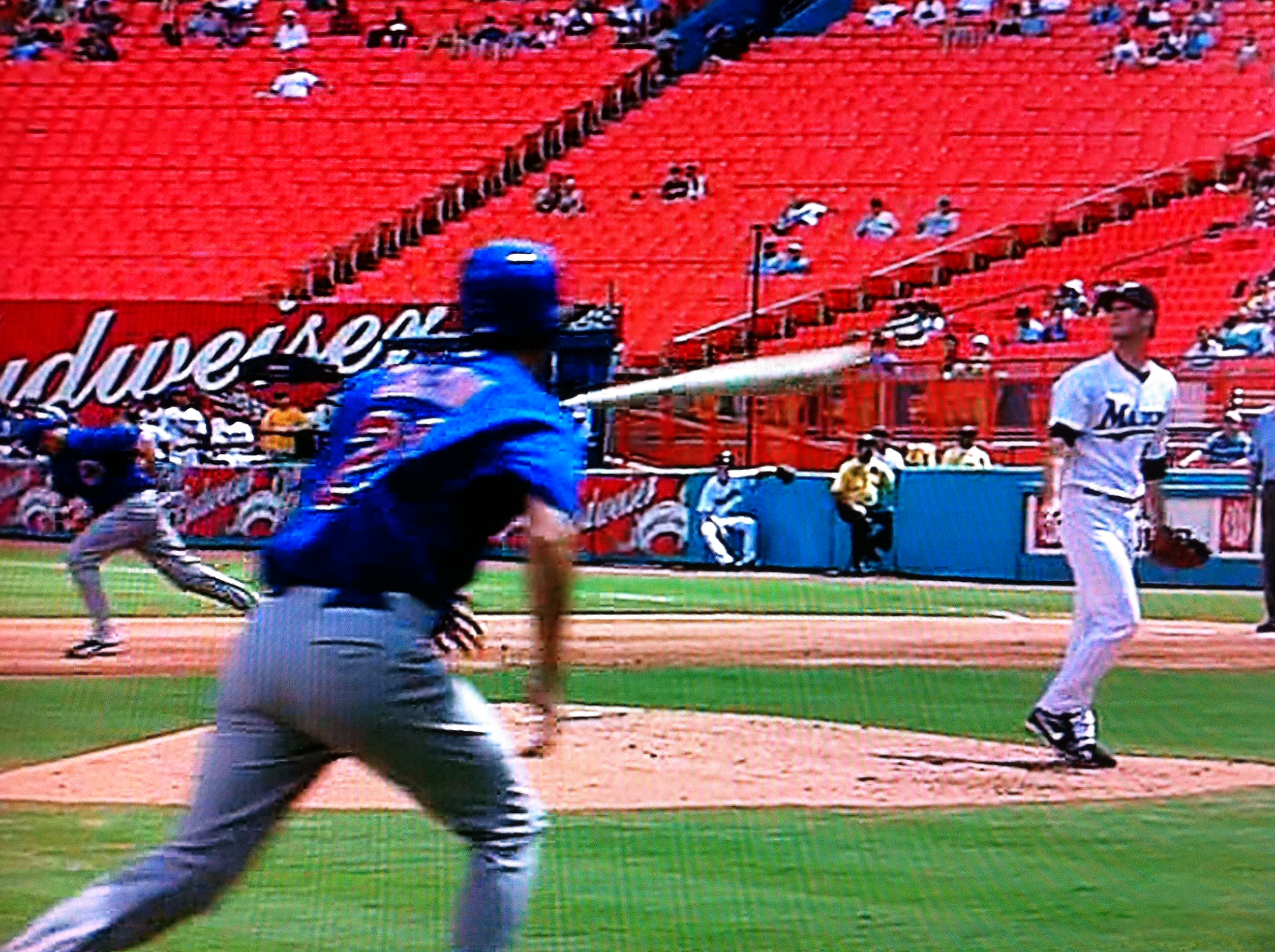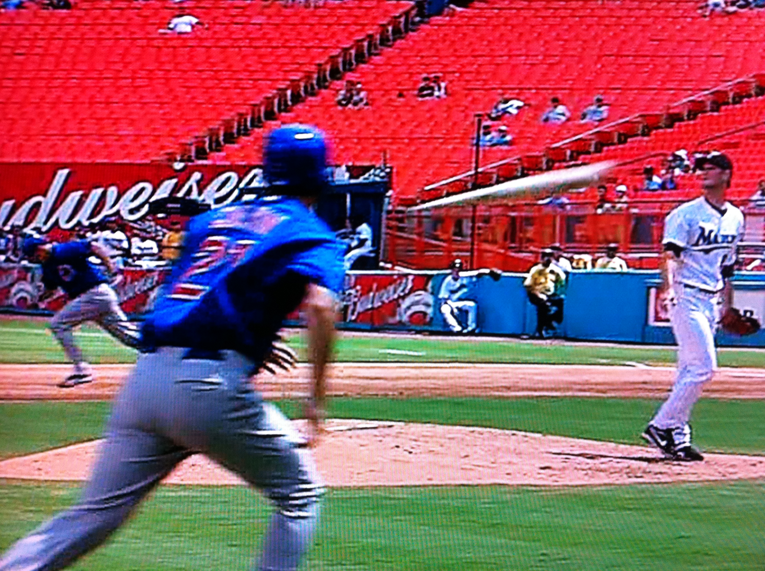 Thanks to the telecasts of the Cubs-Marlins by Fox Sports Florida and the superb DVR service of MLB.Com’s MLB.TV, we get a good, albeit blurry image of the incident this afternoon in Florida in which Cubs’ rookie outfielder Tyler Colvin suffered a season-ending partial lung collapse when he was in the chest speared by a large shard of the broken bat of teammate Wellington Castillo: