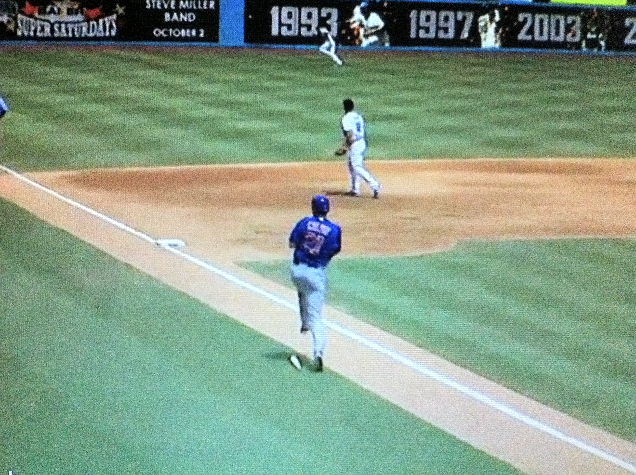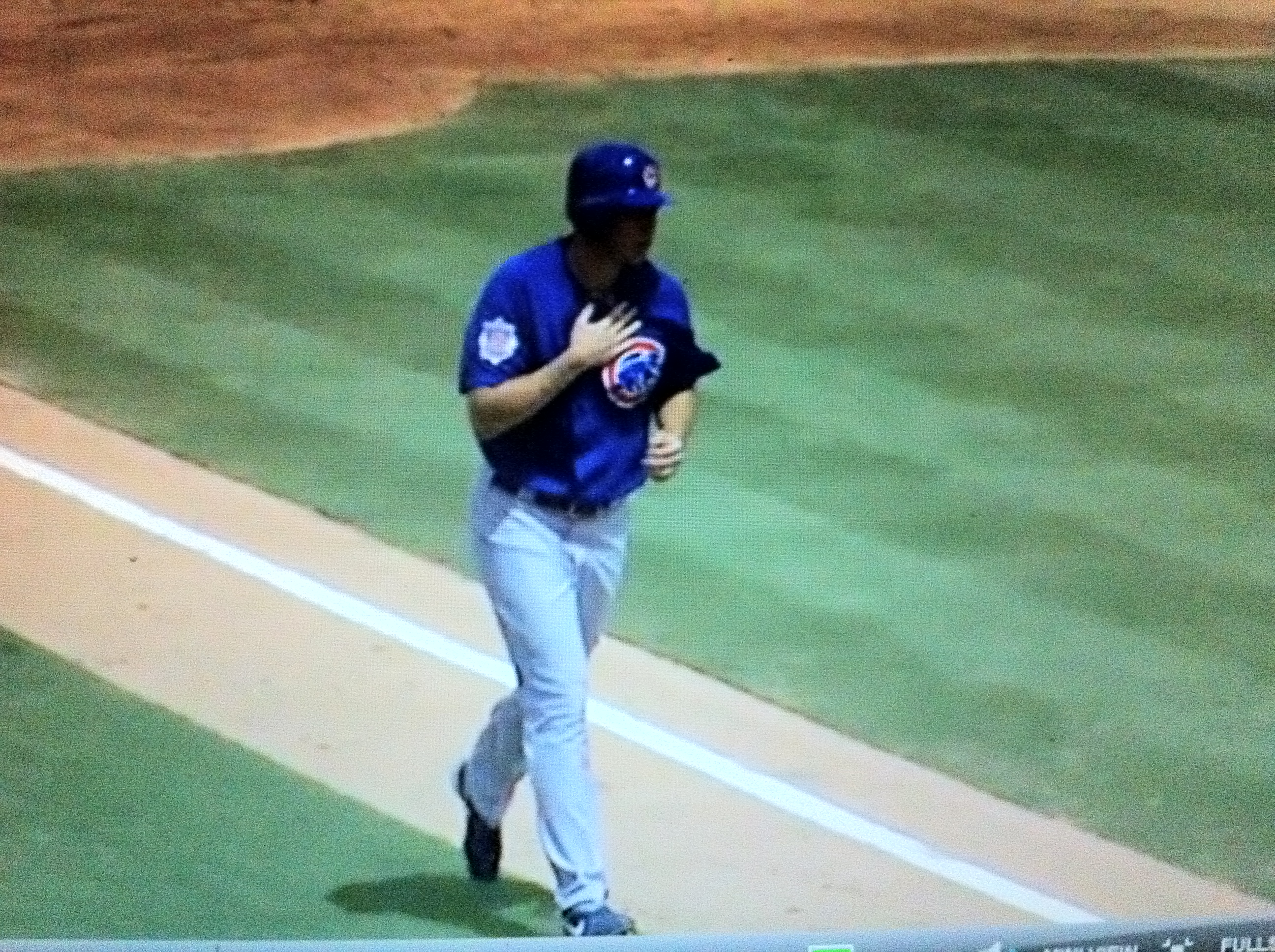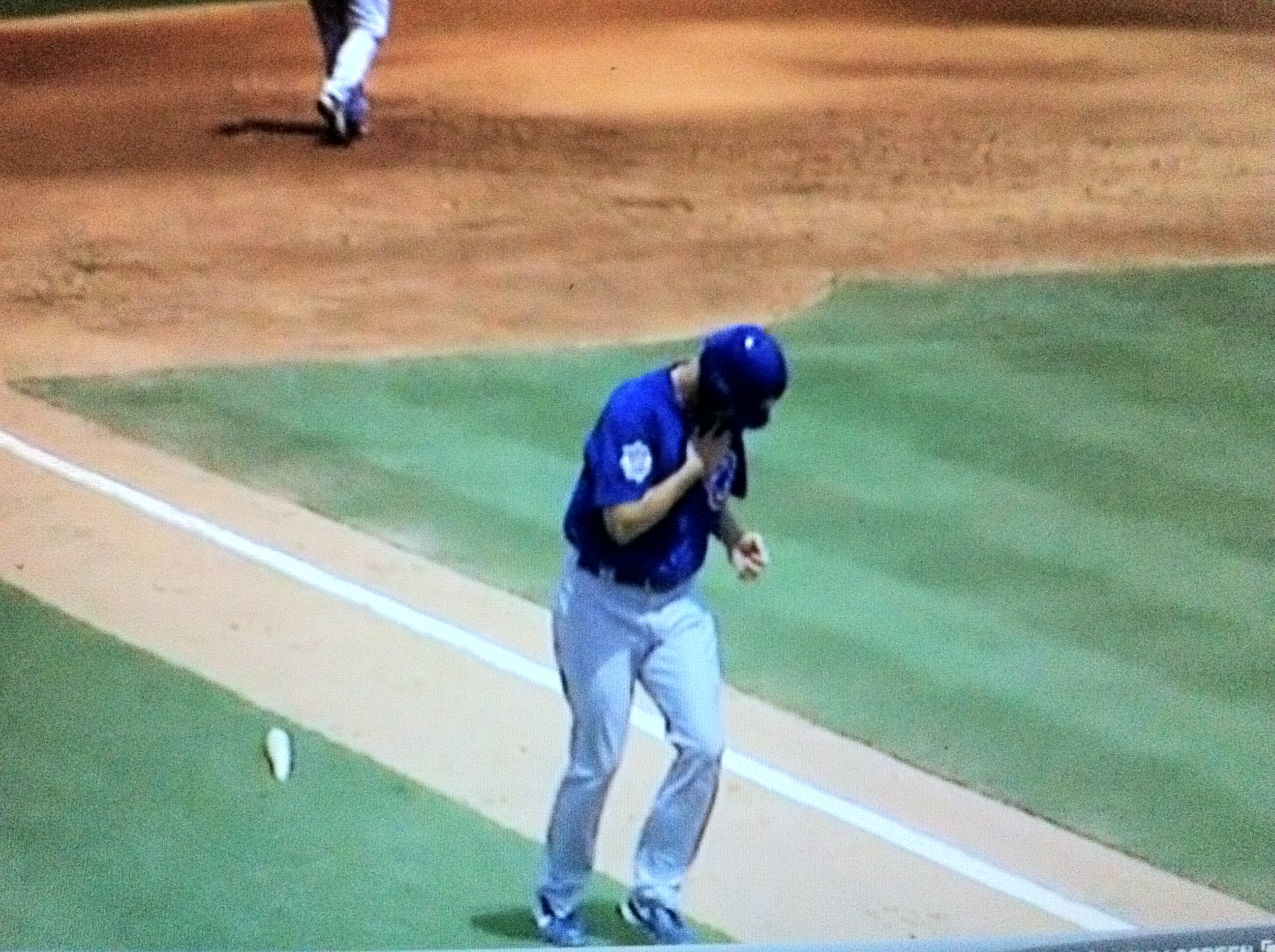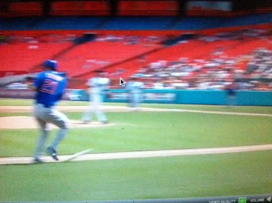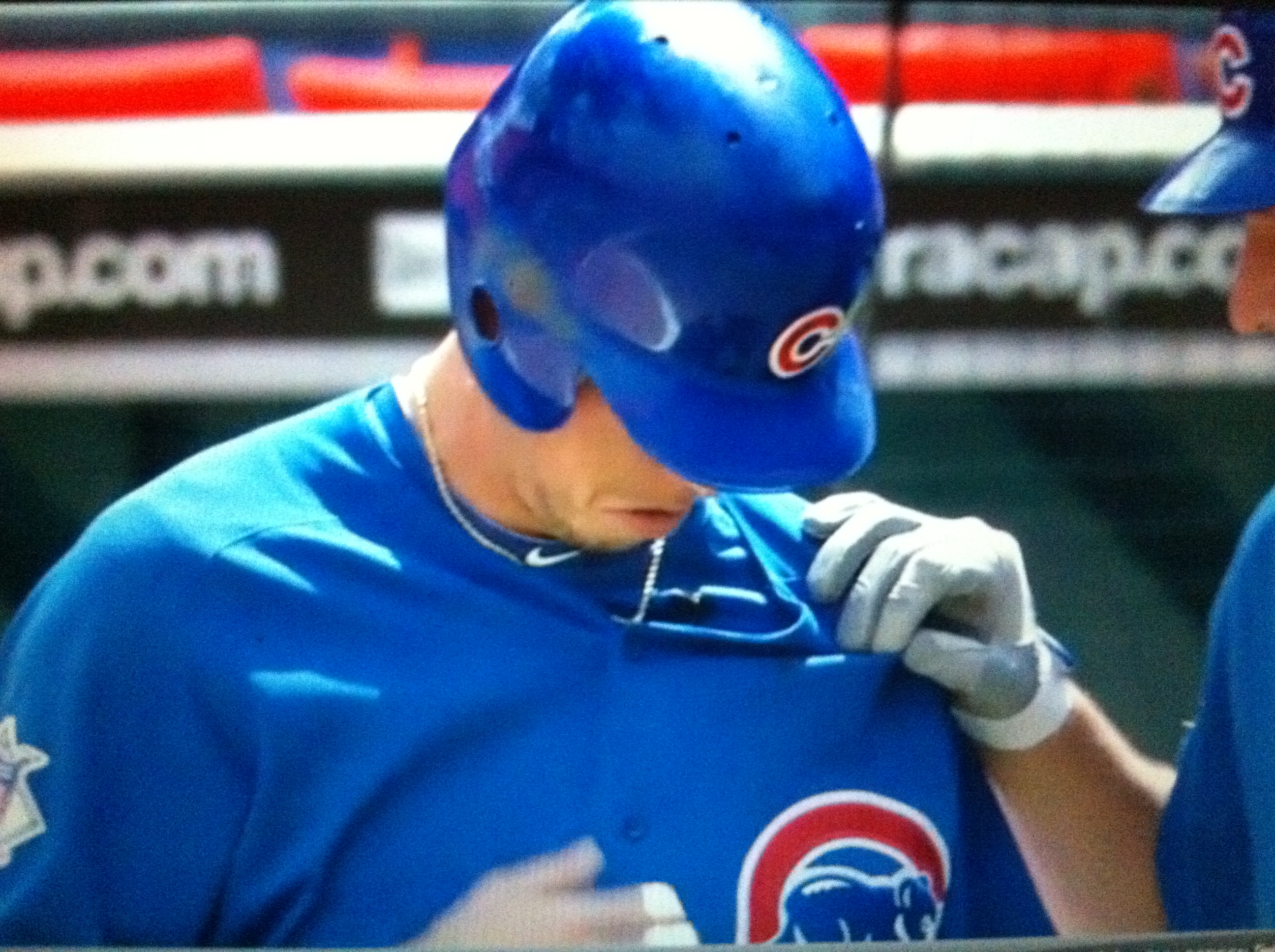 Thanks to the telecasts of the Cubs-Marlins by Fox Sports Florida and the superb DVR service of MLB.Com’s MLB.TV, we get a good, albeit blurry image of the incident this afternoon in Florida in which Cubs’ rookie outfielder Tyler Colvin suffered a season-ending partial lung collapse when he was in the chest speared by a large shard of the broken bat of teammate Wellington Castillo: