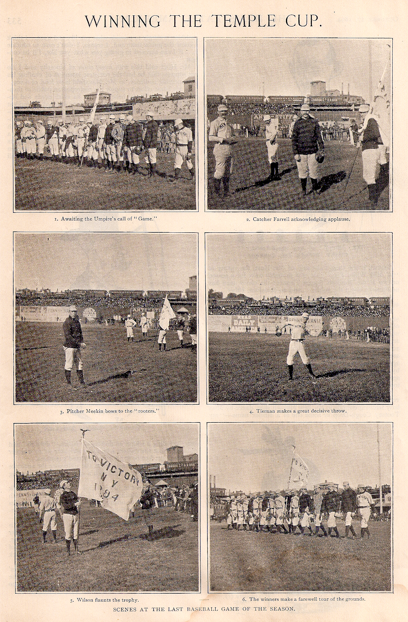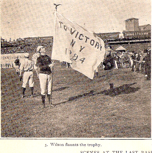 Okay, I’ll stop being so picky. These are photos of the long-forgotten Temple Cup, and its long-forgotten winners, the ’94 Giants. Some of the player ID’s are clear now: the thin guy just to the left of flag-bearer Parke Wilson appears to be Mike Tiernan. On the other side, with the ‘stache, is George Van Haltren. Not sure who’s next, but the four furthest right are Amos Rusie (I believe), Duke Farrell, Jouett Meekin, and – his stride here confirms it – Johnny Ward. Somewhere in that group is one more Hall of Famer, Giants’ third baseman George Stacey Davis. It’s too bad the Orioles didn’t wander over to the “Illustrated American” photographer. John McGraw was the third baseman on that team, and among his teammates, Dan Brouthers, Hughie Jennings, Wee Willie Keeler, Joe Kelley and Wilbert Robinson all went to Cooperstown (as did non-playing manager Ned Hanlon).