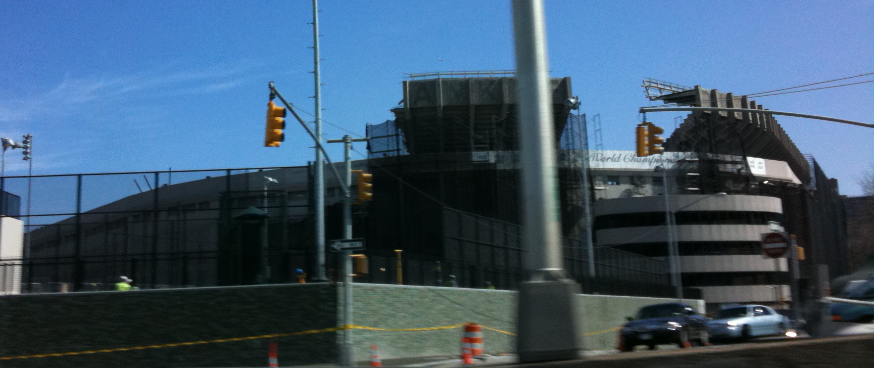 Taken from The Major Deegan Expressway (New York Thruway) this afternoon – the third base side of the upper deck is long gone and about the rest of it, the first impression is apparently universal: it looks like they’ve stolen part of the old Yankee Stadium. The big blue letters are long gone, and the shadows left spell out “A N K E E D I U M.”