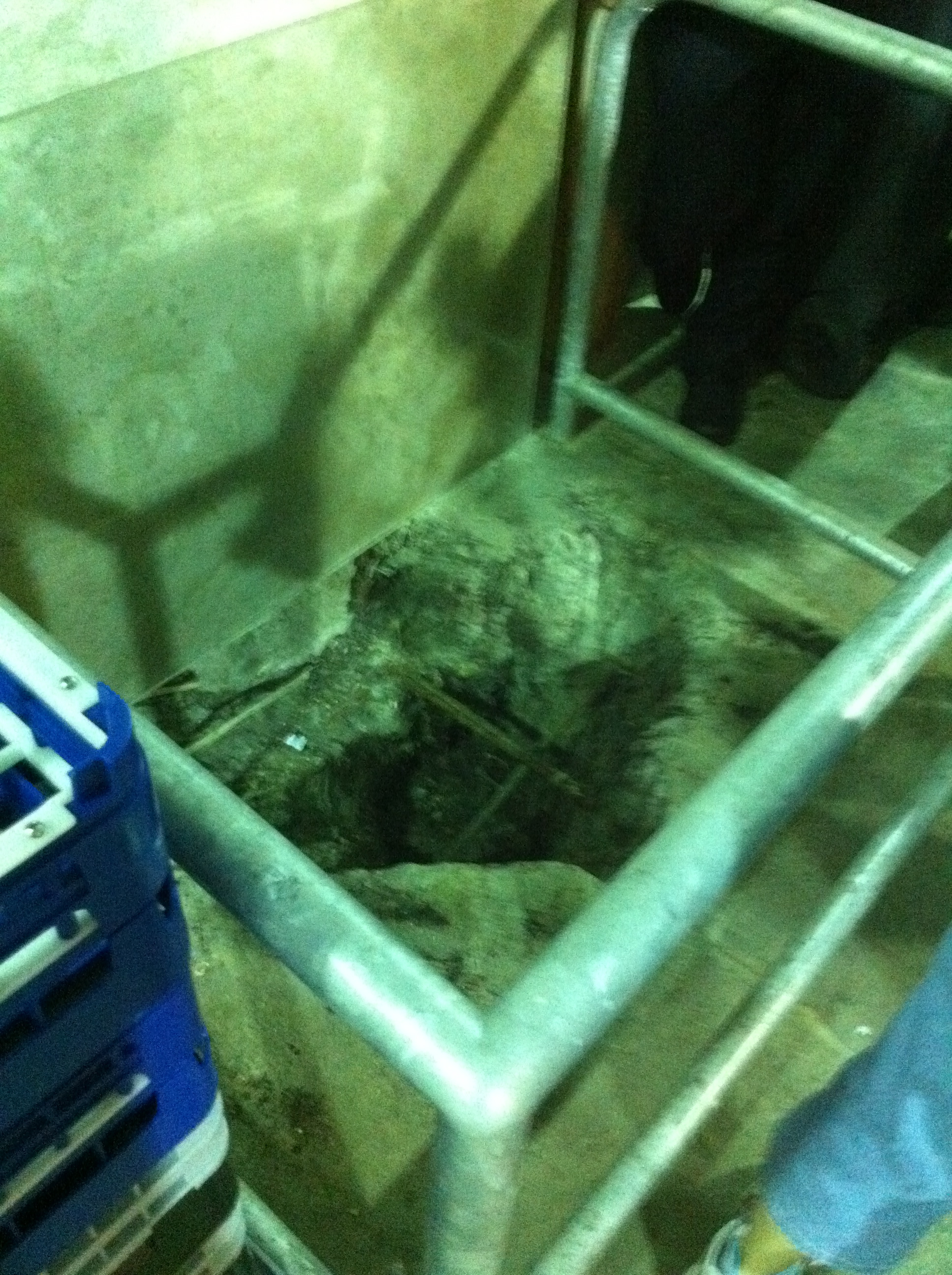 The seemingly solid surface shown in the first photo is in fact a large piece of plexiglas, clouded with dust, which can be lifted up by an alert uniformed attendant, for the benefit of fans in the Suites Club. They can then stand around and take pictures of an attempted Reverse Curse (or, for the less dramatically-inclined, a hole in the ground).