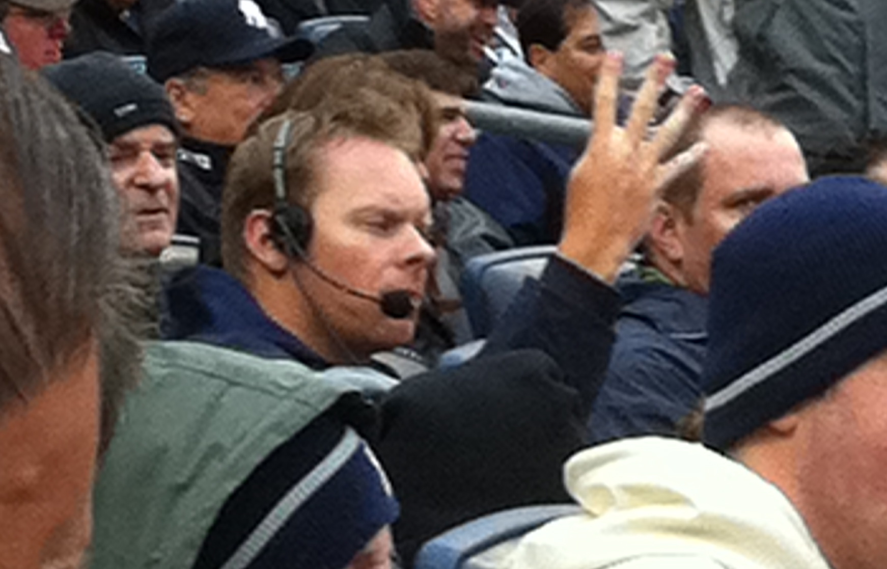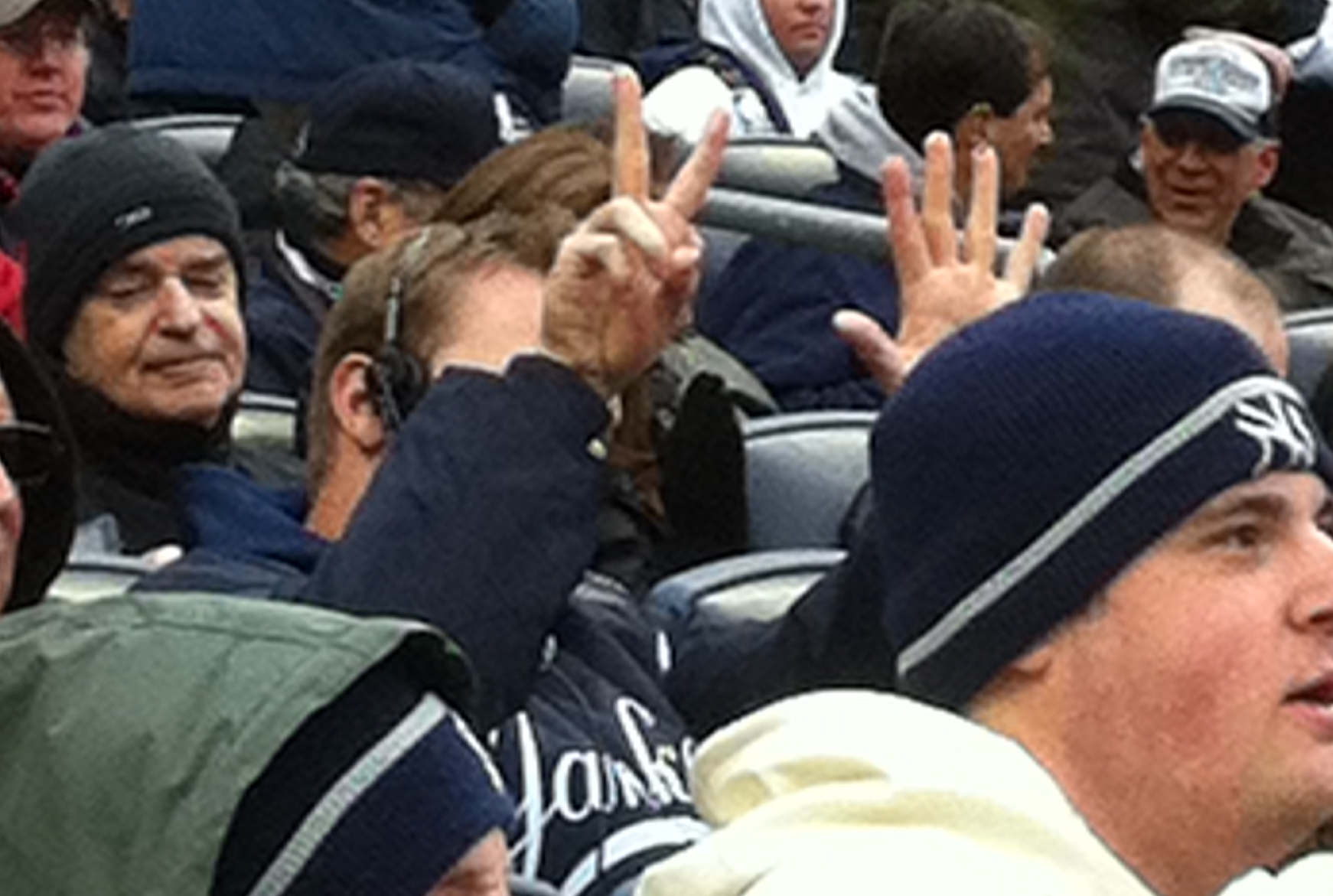 In the middle of an ad hoc “news conference” in which I insisted that it might be bizarre for a team employee to be giving an active player a kind of hand-signal play-by-play but it didn’t strike me as cheating, who walks over but General Manager Cashman. I’ve only known him fifteen years or more and he decided to make a joke about Weber signaling for beers, and then to explain that it had all been cleared up and Weber would be back in his seat for the next day’s game, and that certainly the Yankees weren’t upset with me for tweeting the photo.
