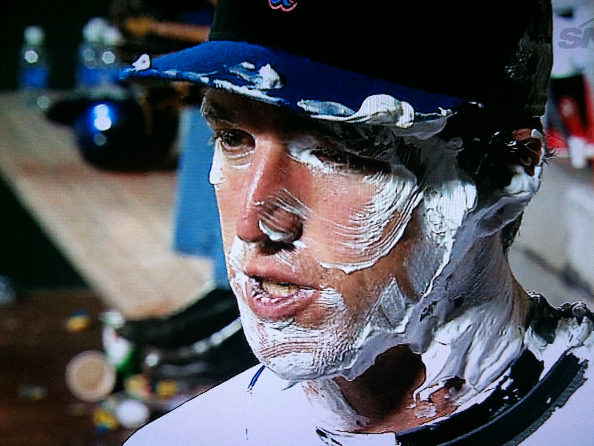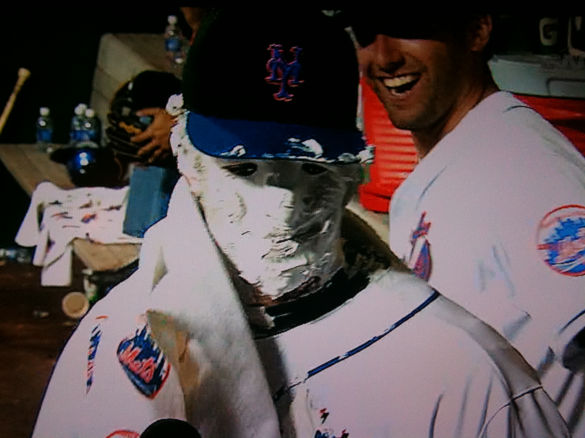 Ike Davis, savaged by Jeff Francoeur during Kevin Burkhardt’s interview (shaving cream hits about 0:45 in SNY.TV post-game report) on SNY after his 2-for-4, 1 RBI debut tonight: