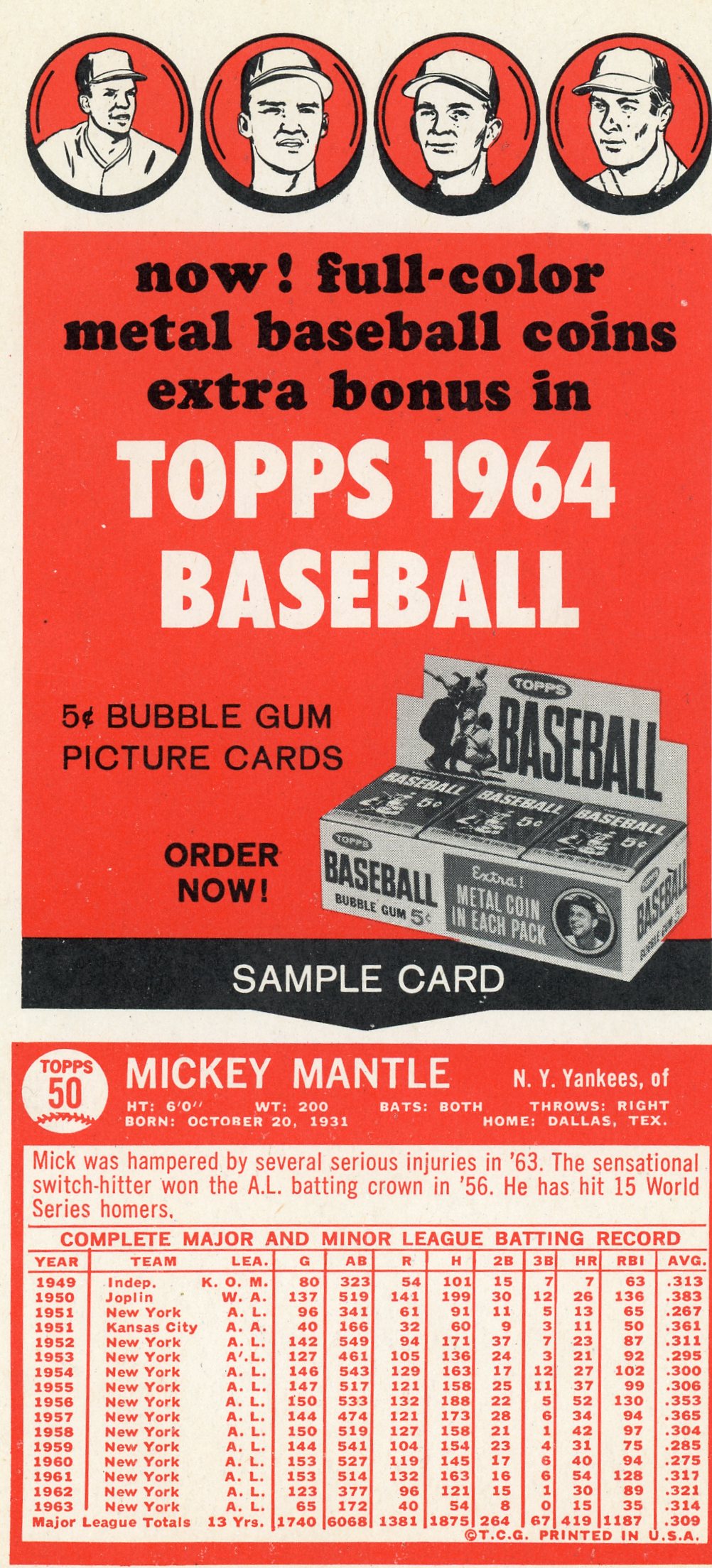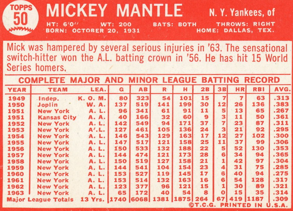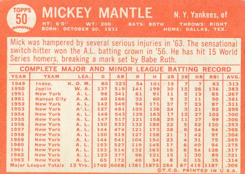 Now, take a look at the back of this 1964 Topps baseball card of Mickey Mantle: